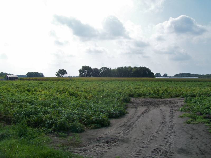 Deze foto is gemaakt op 3 september 2017 naast het erf van het huis aan de Rietgoorsestraat nummer 111 op het platteland van de gemeente Roosendaal. Op 250 meter afstand bij de bomen stroomt, vanaf hier niet te zien, een beek. Deze beek ligt diep in het landschap. Vroeger heette de beek op deze plaats de Warbergse beek. De kijkrichting op de foto is zuidzuidwest en het gebied heet Warberg. De locatie van deze foto ligt 5 kilometer ten zuidwesten van het centrum van Roosendaal.