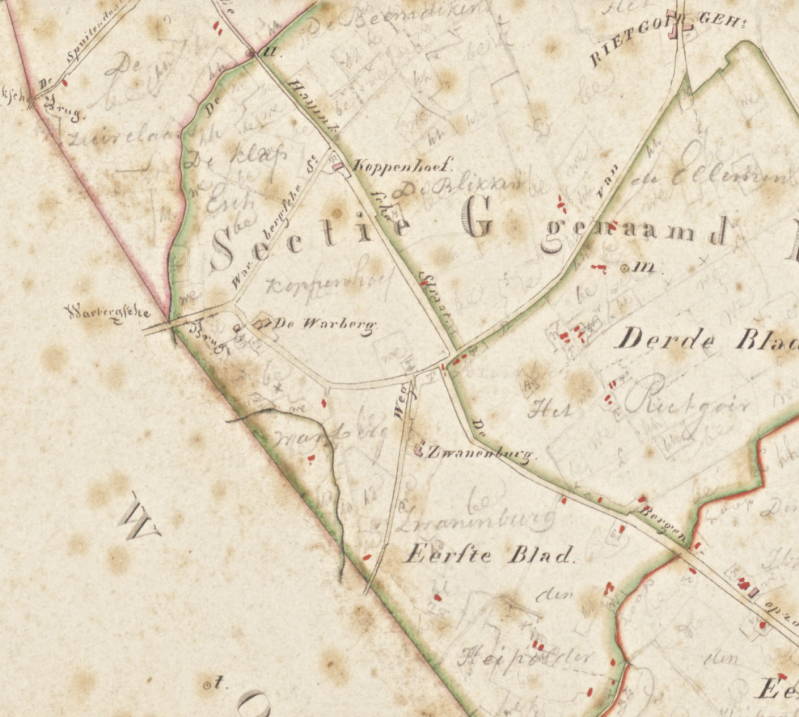 Kadastrale kaart van de gemeente Roosendaal opgemaakt in 1823. Gezien de boerderijnamen Koppenhoef en Zwanenburg is het mogelijk dat De Warberg ook een boerderijnaam is. Deze boerderij stond aan de Noordoost-zijde van wat nu de Rietgoorsestraat heet. In potlood staat de naam Warberg daar waar de beek een bocht maakt en het grondgebied van Roosendaal verlaat. Bij de Warbergsche brug komt de beek weer op Roosendaals gebied.
