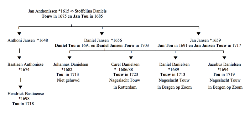 De familie zoals die voorkomt in hierna volgend schema gebruikte de naam Touw of Tou in ieder geval op papier voor 1713 slechts zelden. In de notariële akten en in de Doop-, Trouw- en Begraafboeken komen leden van deze familie voor met hun voornaam en de vadersnaam, al dan niet verbogen. Het zogeheten patroniem. Tussen 1713 en 1723 begint het gebruik van de naam Touw op te komen. Johannes, Carel, Daniel en Jacobus, de vier zonen van Daniel Jansen Touw komen vanaf 1713 regelmatig voor met de naam Touw en/of Tou. Aanvankelijk is de spelling niet vast. Maar in de loop van de achttiende eeuw komt de schrijfwijze Touw vast te liggen.