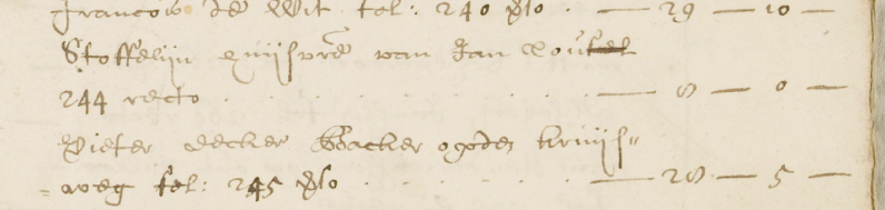 In schuldboek D komt ‘Stoffelijn huijsvrouwe van Jan Toufol / 244 recto’ voor. Zij is de overledene 8 gulden schuldig. Eerst was er onduidelijkheid over de naam Tou. Er staat Toufol geschreven, fol is doorgehaald. Op de nieuwe regel had fol 244 recto moeten staan.[i] Zodat veilig geconcludeerd kan worden dat er Jan Tou staat.